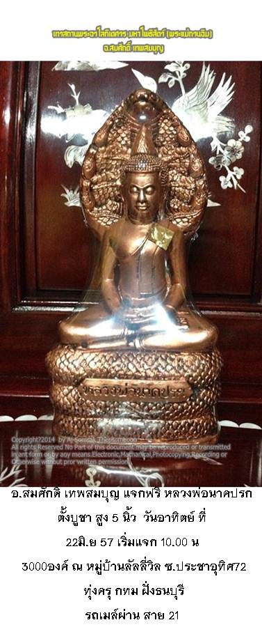 | หัวข้อกระทู้ : แจ้งข่าว ท่าน อ.สมศักดิ์ เทพสมบุญ แจกฟรี หลวงพ่อนาคปรก ตั้งบูชา สูง 5 นิ้ว 22มิ.ย 57 |
