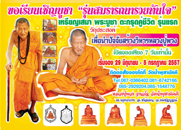 ติดต่อสั่งจองได้ที่ วัดน้ำพุสามัคคี ต.พระพุทธบาท อ.ชนแดน จ.เพชรบูรณ์ ในวันอาทิตย์ที่ 29 มิถุนายน 2557 ถึงวัน เสาร์ ที่ ๕ กรกฏาคม ๒๕๕๗ เท่านั้น !!!!
