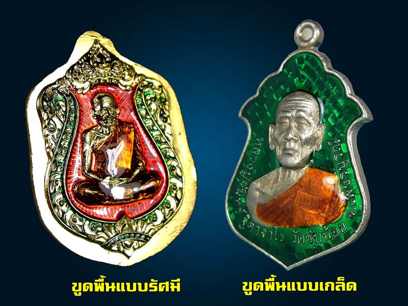 โดยพื้นเหรียญจะมีการขูดเป็นรัศมี โดยจะเป็นเส้นออกจากองค์หลวงพ่อเงินรอบๆองค์พระทั้งหมด กับ อีกแบบที่เห็นกันบ่อยๆ คือการขูดเป็นแอ่งหรือเป็นเกล็ดครับ