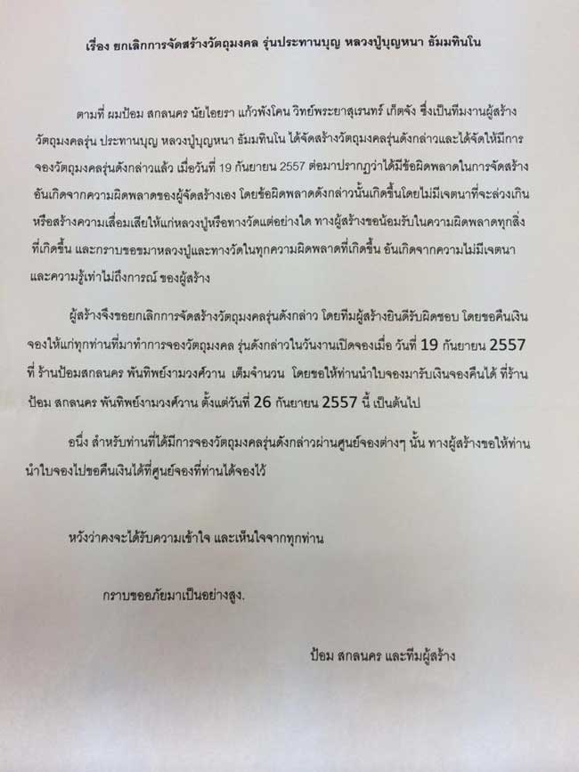 ทีมงานผู้สร้าง วัตถุมงคลรุ่น ประทานบุญ ขอเรียนชี้แจงเกี่ยวกับเรื่องราวการจัดสร้างวัตถุมงคลดังกล่าวว่า เหตุการณ์ต่างๆที่เกิดขึ้น เนื่องมาจากความผิดพลาดของผู้สร้างเอง โดยไม่ได้มีเจตนาที่จะล่วงเกิน หรือสร้างความเสื่อมเสียให้แก่หลวงปู่หรือทางวัดแต่อย่างใด ทางผู้สร้างขอน้อมรับในความผิดพลาดทุกสิ่งที่เกิดขึ้น และขอขมาทางหลวงปู่และทางวัดในทุกความผิดพลาดที่เกิดขึ้นโดยไม่เจตนา และรู้เท่าไม่ถึงการณ์ ของผู้สร้างทุกกรณี