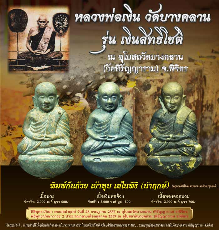 รูปหล่อหลวงพ่อเงิน วัดบางคลาน รุ่น เงินสิทธิโชติ ได้มีพิธีปลุกเสกวาระที่ 2 เป็นที่เรียบร้อยแล้ว เมื่อวันที่ 23 ตุลาคม 2557 ที่ผ่านมา ณ พระอุโบสถ วัดบางคลาน