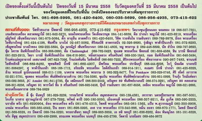สนใจ สั่งจองได้ที่ วัดห้วยเงาะ และ ศูนย์จอง ชั้นนำ ต่างๆ ทั่วประเทศ ได้ ตามรายชื่อ นี้ครับ