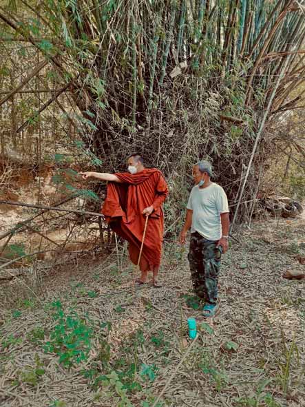 ( เนื่องจากพื้นที่ด้านล่างจุดนี้ ทุกปีน้ำป่า จะไหลผ่านลงมาท่วมสูง ราว 3-4 เมตร โดยประมาณ จากคำบอกของคณะศรัทธาชาวบ้าน ดังนั้นจึงจำเป็น ที่ต้องทำเขื่อนหิน ผนังกั้นน้ำ เพื่อป้องกันแนวคันดิน ตลอดถึง เพื่อลดแรงกระแทกของน้ำป่าที่ไหลมา เพื่อไม่ให้ตลิ่งพังทลาย และ ทรุดหายไปกับสายลำน้ำแม่พวก ฯ )