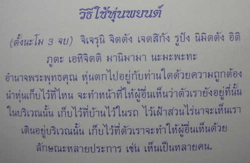 หรือท่านผู้ใด้มีใจใฝ่ทางด้านเสี่ยงโชคทุกชนิด ก็ควรมีไว้พกติดตัวบูชาอย่างเป็นเนืองนิจ (ซึ่งหากงวดใดมีโชคมีลาภ "หุ่นพยนต์โลหะอาถรรพ์" จะมาปรากฏตัวในความฝัน เป็นคนแก่บ้าง หนุ่มบ้าง หรือเด็กบ้าง บอกโชคบอกลาภให้เห็นเป็นประจำ) ///ปล. ช่วงนี้ของปลอมระบาดหนักมาก และราคาจะถูกผิดปกติ ผู้ศรัทธาหน้าใหม่ พึงควรระมัดระวังในการเช่าหาบูชาให้ดีน่ะครับ///