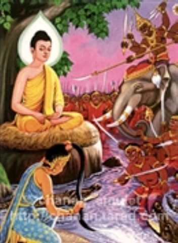 ซึ่งตามพุทธประวัตินั้น ได้กล่าวไว้ว่า ก่อนที่ "สมเด็จพระสัมมาสัมพุทธเจ้า" จะ "ตรัสรู้" ในวันเพ็ญ เดือนหก ณ.ใต้ต้นศรีมหาโพธิ์นั้น "พญามาร" พร้อมด้วย "เสนามาร" ได้ยกพลจำนวนมาก มากีดกัน "สมเด็จพระสัมมาสัมพุทธเจ้า" ไม่ให้ตรัสรู้ โดย "พญามาร" จึงได้เนรมิตแขนมากเป็นพันๆ แขน เพื่อทำการพุ่งรบต่อสู้กับ "สมเด็จพระสัมมาสัมพุทธเจ้า" แต่ ่"สมเด็จพระสัมมาสัมพุทธเจ้า" ได้นึกถึง "บารมี 10 ทัศ" ของพระองค์ ที่ได้เคยบำเพ็ญมาแล้วในทศชาติ (10 ชาติ ก่อนสำเร็จเป็น "สมเด็จพระสัมมาสัมพุทธเจ้า") มี "ทานบารมี" ในชาติสุดท้าย เป็นต้น ฉับพลันนั้น "พระแม่ธรณี" ได้ปรากฏกายขึ้น เพื่อยืนยันถึง "บารมี 10 ทัศ" ที่พระองค์ได้เคยบำเพ็ญมาแล้วในทศชาติ และได้บีบน้ำจากมวยผมให้ท่วม"พญามาร"และ "เสนามาร" ที่มารังควาญ "สมเด็จพระสัมมาสัมพุทธเจ้า" เป็นผลให้พระองค์ทรงเอาชนะ "พญามาร" และ"เสนามาร" ทั้งหมดได้ และสำเร็จเป็น"สมเด็จพระสัมมาสัมพุทธเจ้า" ได้ในวันนั้น