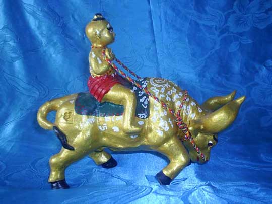 กุมารทองขี่วัว, กระทิง, ควาย ที่กล่าวมาเป็นรุ่นเดียวกันกันอยู่ที่ว่าช่างปั้นจะปั้นเป็นเขาแบบใด ส่วนองค์นี้ เป็นขี่กระทิง ไม่น่าจะมีมากสักเท่าไหร่ พอๆกับขี่ควาย จึงมีความนิยม และราคาสูงกว่า เป็นเนื้อดินเผา ปัจจุบันมีรุ่น2 แต่สร้างเป็นโลหะ รุ่นแรกหายากแล้วในปัจจุบัน (องค์นี้หลวงปู่แย้มเมตตา จารยันต์ให้ด้วยตัวท่านเองเลยทีเดียว) ถือว่าโชคดีครับ