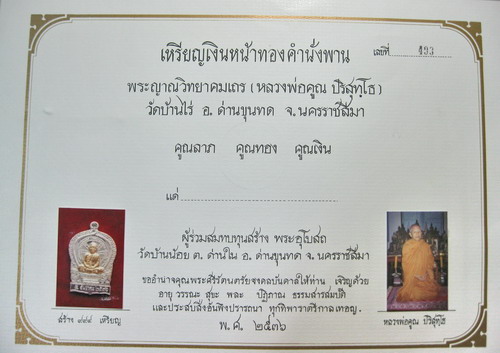 เหรียญสมาธิคูณนั่งพานรุ่นแรก หลวงพ่อคูณ วัดบ้านไร่ เนื้อเงิน หน้ากากทองคำ ปี 2536 หมายเลข 493 พร้อมใบอนุโมทนาบัตร ครับ