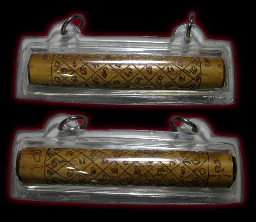 ตะกรุดไม้ไผ่ หลวงพ่อจันทร์ วัดมฤคทายวัน จารอักขระยันต์ด้วยมือของท่านเองทุกตัวอักขระครับผม ไส้ในเป็นทองแดงลงอาคม กรรมวิธีของท่านคือ นำโลหะที่จะใช้มาปลุกเสก แล้วนำมาหลอมรีดเป็นแผ่นยันต์ จารอักขระลงยันต์ แล้วนำไม้ไผ่ที่มีลักษณะที่ดีมาลงอักขระเสกยันต์ สอดตะกรุดทองแดงเข้าด้านใน แล้วก็เสกลงอาคมอีกครั้งครับ ถือว่าสุดยอดจริงๆ ตามประวัติเคยมีพวกลองดีนำตะกรุดที่ท่านสร้างไปคล้องกับคอสุนัขแล้วเอาปืนไล่ยิง ปรากฏว่าปืนยิงไม่ออกแม้แต่นัดเดียว กระสุนด้านหมด และสุนัขตัวนั้นเผอิญว่าเป็นสุนัขที่อาศัยอยู่ในวัดมฤคทายวันที่หลวงพ่อจันทร์ท่านได้เลี้ยงเอาไว้ ตามธรรมชาติของสัตว์แล้ว เมื่อมันตกใจหรือหนีอะไรมาก็จะต้องวิ่งกลับเข้าหาเจ้าของหรือถิ่นที่มันอาศัยอยู่ มันจึงวิ่งหนีกลับมาที่วัด หลวงพ่อท่านเห็นพอดี จึงเรียกแล้วเอาตะกรุดและเชือกที่พันคล้องคอมันอยู่ออกทันที และก็ได้กล่าวกับชาวบ้านเหล่านั้นว่า ฉันทำให้ไว้เพื่อคุ้มครอง ป้องกันภัยกัน แต่ท่านนำมาล้อเล่น เบียดเบียนชีวิตสัตว์เช่นนี้ ต่อไปฉันก็จะไม่ทำให้ใครแล้ว (ตามประวัติที่เล่าขานสืบต่อกันมาครับ) ขนาดของตะกรุดยาว 7 ซม.