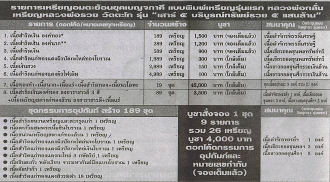 7. ชุดกรรมการ อุปถัมภ์ได้รับ 26 เหรียญ สร้าง189 ชุด 4,500บาท (แถมเนื้อดำจักรพรรดิ์ฯ 1 องค์+เนื้อเขียวยอดขุนพลทรัพย์ทวี 3 องค์+เนื้อขาวยอดขุนศึกรวยเงินล้าน 5 องค์)