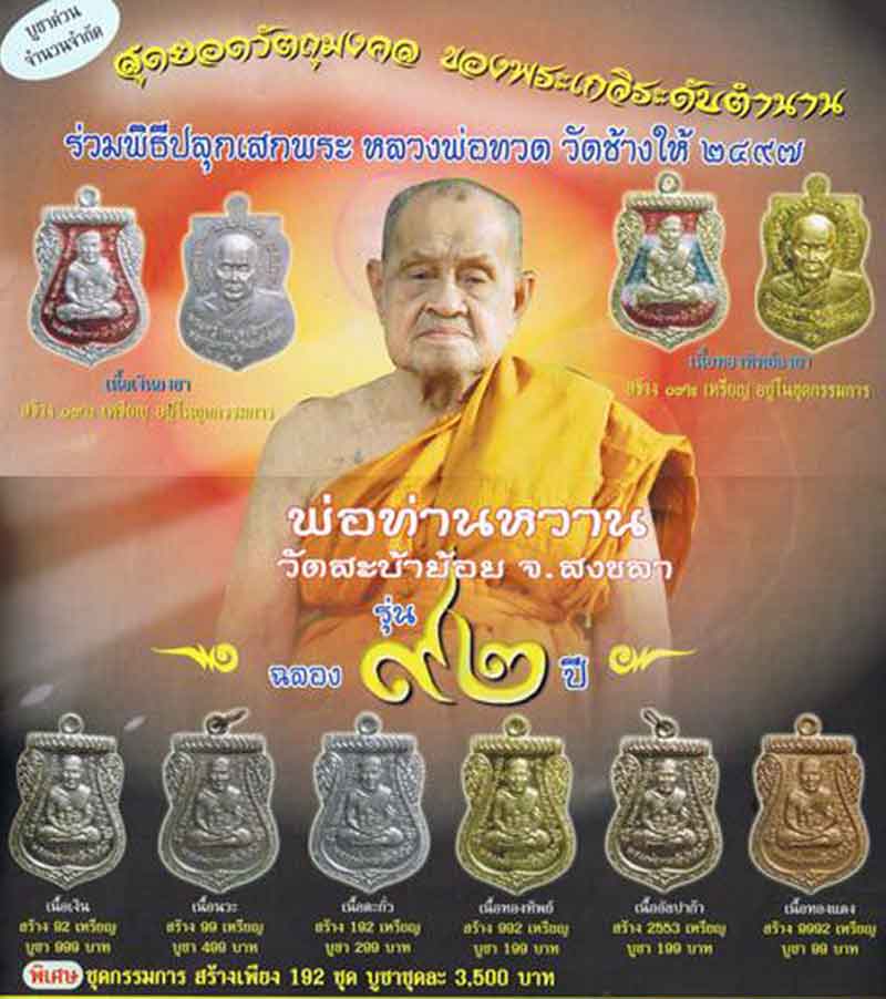 5. เหรียญเนื้อทองทิพย์ สร้างจำนวน 992 เหรียญ บูชาเหรียญละ 199 บาท 6. เหรียญเนื้ออัลปาก้า สร้างจำนวน 2553 เหรียญ บูชาเหรียญละ 199 บาท