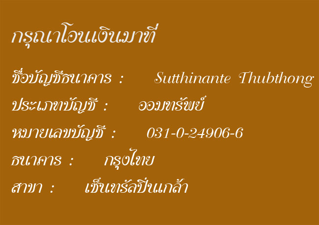 สำหรับเพื่อนๆบางท่านที่ได้โอนเงินค่าพระแล้วทั้งนอกเวบและในเวบ โอนแล้วแต่ไม่ได้แจ้งการโอนกรุณาแจ้งให้ทราบด้วยนะครับ เพราะว่าบางรายการราคาเท่ากัน จึงทำให้ไม่ทราบว่าใครเป็นคนโอน เพื่อนๆอาจจะลืมแจ้ง ไงก็แจ้งหให้ทราบด้วยนะครับ |