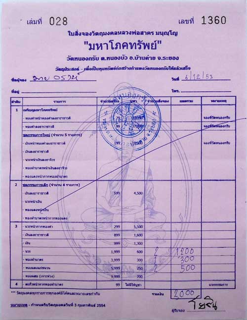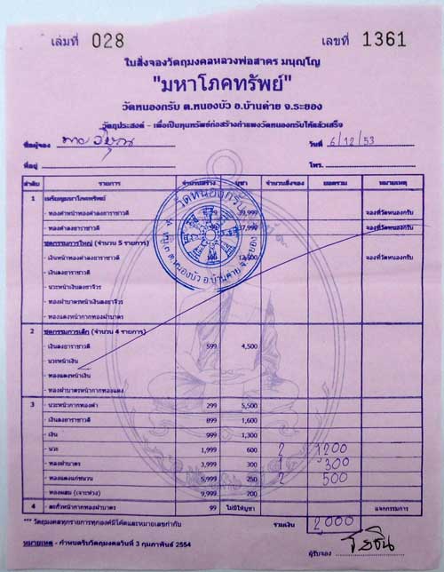 ใบจองวัด มหาโภคทรัพย์ หลวงพ่อสาคร วัดหนองกรับ ชุดนวะ