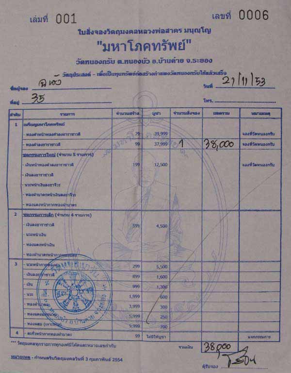 ใบจองเหรียญมหาโภคทรัพย์ เนื้อทองคำเลข 35