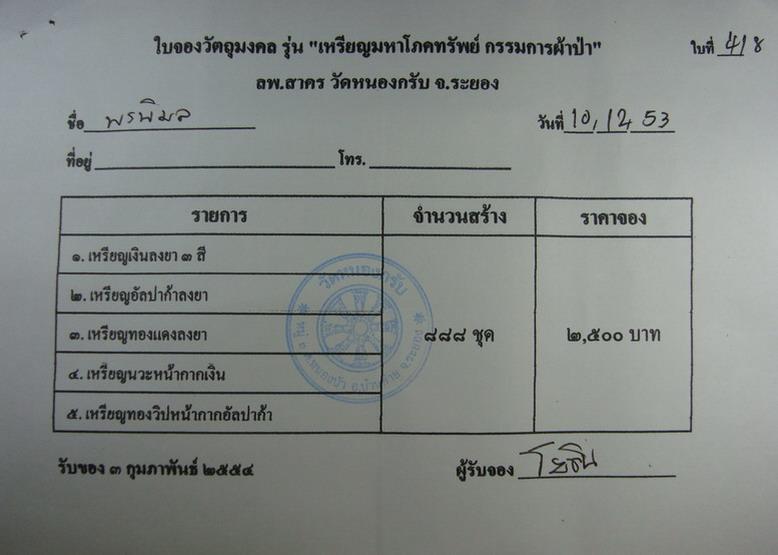 ใบจอง เหรียญมหาโภคทรัพย์ ชุดกรรมการผ้าป่า(ใบจองวัด) 4 ใบ