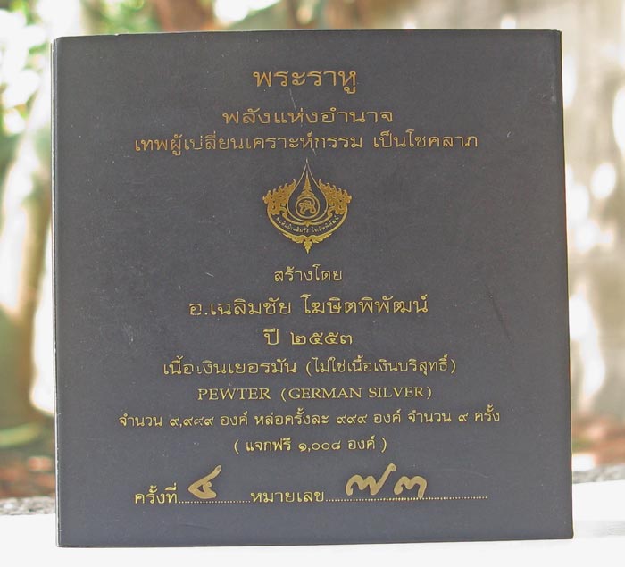 ------ พระราหูองค์นี้ เสียงกริ่งดังสนั่น " กริ้งๆๆ" ฟังได้ชัดเจนมากกกก ไม่ติดขัด เป็นองค์ที่ผมคัดไว้เพื่อโชว์ ( พอดีได้เลข 1 หลักมา ก็กัดปากเช่ามาเหมือนกัน แต่ไม่แพงครับ เพราะว่าผมพอใจ หากไม่พอใจ 10 บาทก็ถือว่าแพง ) เหรียญนี้น่าเก็บเพราะว่า เป็น 1 ใน 200 องค์ ที่มีด้านหลังเป็นรูปตัว v และเป็นเลข 2 หลัก พระสวยมีมิติ สภาพเดิมๆจากที่อาจจารย์เฉลิมชัยขัดครับ ท่านที่มองดูจากรูปภาพ จะไม่เหมือนคนที่ได้เห็นตัวจริง ตัวจริงองค์ราหู มีเสน่ห์ ดวงตาของพระจันทร์ หากท่านสังเกตด้วยจิตวิญญาณ ก็จะเห็นว่าเหมือนชีวิต ( "จิตวิญญาณ")