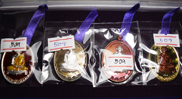 เนื้อเงินลงยาราชาวดีสีแดง ๑ เหรียญ เนื้อนวะหน้าเงิน ๑ เหรียญ เนื้อทองแดงหน้าเงิน ๑ เหรียญ และเนื้อทองฝาบาตรหน้ากากทองแดง ๑ เหรียญ รวม ๔ เหรียญ