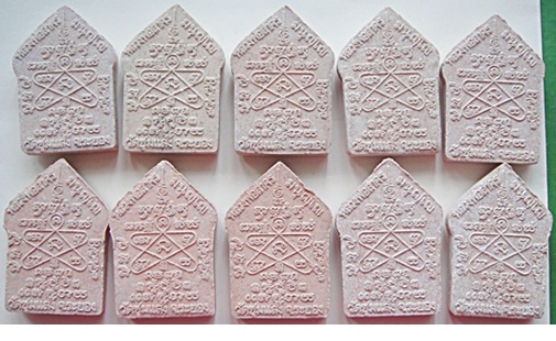 พระขุนแผนผงพรายกุมาร หลังยันต์ห้า สำหรับแจกเป็นที่ระลึกในพิธีฉลองกุฎิใหม่ (กุฏิให้พระเข้าปริวาส -ปฎิบัติธรรม) วัดชุมแสง จังหวัดระยอง หลวงพ่อสาคร วัดหนองกรับ จังหวัดระยอง ปลุกเสก