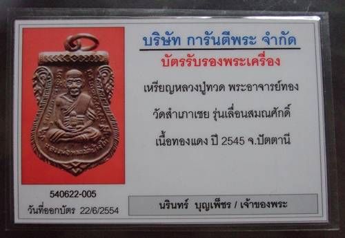 | หัวข้อกระทู้ : เหรียญเลื่อนสมณศักดิ์ อ.ทอง วัดสำเภาเชย เนื้อทองแดง ปี 45 มาพร้อมใบการันตี ครับ |