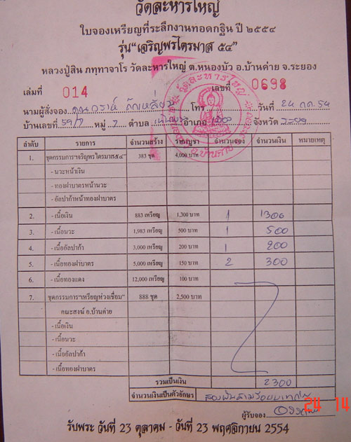 @@ ใบจองตัวจริงเหรียญเจริญพรไตรมาส "หลวงพ่อสิน" วัดละหารใหญ่ @@
