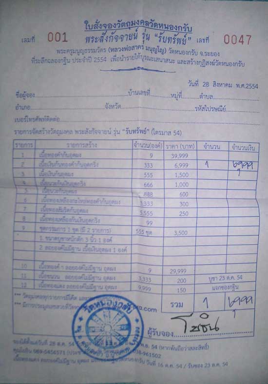 แบ่งใบจองวัด เนื้อเงินก้นทองคำอุดกริ่ง สร้าง ๓๓๓ องค์
