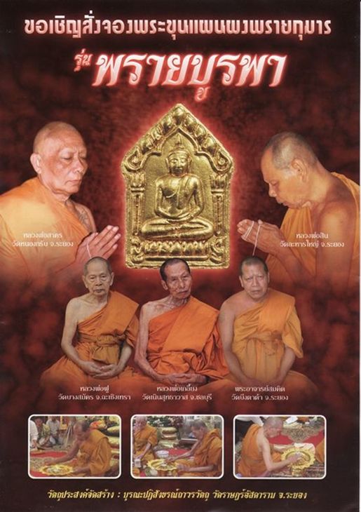 เชิญสั่งจองราคาวัด***พระขุนแผนผงพรายกุมาร รุ่นพรายบูรพา สร้างตามตำราหลวงปู่ทิม วัดละหารไร่ มีลูกอมผงพรายกุมารของหลวงปู่ทิม เป็นชนวนมวลสารหัวเชื้อ ผงเก่าหลวงปู่ทิมผงพุทธคุณต่างๆ ว่านหลักที่มาทำขุนแผน ได้แก่ ว่านสบู่เลือด เด่นทางด้านคงกระพันชาตรี ว่านดอกไม้ทอง เด่นทางด้านเมตตามหานิยม และว่าน 108 ชนิดซึ่งเน้นไปทางว่านตระกูลกวัก จะมีอนุภาพทางด้านโชคลาภ เมตตามหานิยม ดีทางโภคทรัพย์ เป็นสิริมงคลแก่ผู้ครอบครองเป็นสง่าราศรีแก่ผู้ที่พบเห็น อธิฐานจิตโดย หลวงพ่อสาคร วัดหนองกรับ หลวงพ่อสิน วัดละหารใหญ่ ,หลวงพ่อฟู วัดบางสมัคร,หลวงพ่อเกลี้ยง วัดเนินสุทธาวาส ,พระอาจารย์สมคิด วัดบึงตาต้า