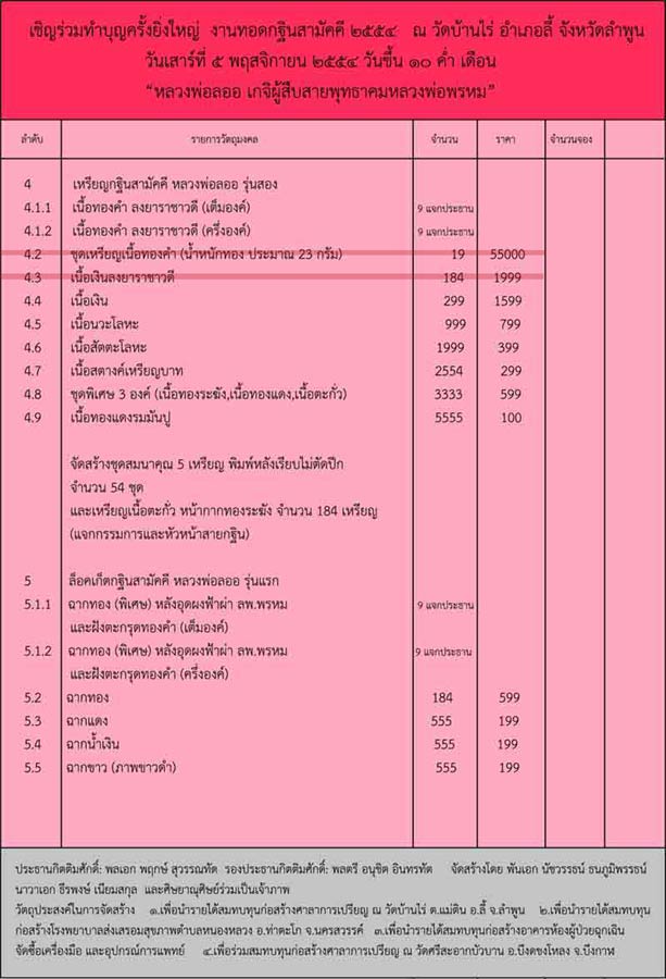 วัตถุประสงค์ในการจัดสร้าง ๑.เพื่อนำรายได้สมทบทุนก่อสร้างศาลาการเปรียญ ณ วัดบ้านไร่ ต.แม่ติน อ.ลี้ จ.ลำพูน