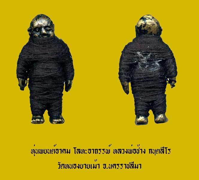 ท่านได้สร้างหุ่นพยนต์ตามตำรับตำราเหมือนหลวงพ่อสง่า วัดหนองม่วงทุกประการ โดยใช้วัตถุอาถรรพ์ ตะปูที่ใช้ตอกโลงศพ เหล็กเขี่ยศพ เป็นต้น เป็นชนวนในการหุ่นพยนต์ชุดนี้ เสร็จแล้ว ก็นำสายสิญจน์มาพันรอบองค์เพื่อเรียกธาตุต่างให้เกิดอาการครบทั้ง ๓๒ จนสามารถรับรู้เห็นเคลื่อนไหวได้เหมือนมีชีวิตจริงทุกประการแอบแฝงซ่อนเร้นในวัตถุธาตุต่างๆ จำนวนการสร้างไม่มากนัก ถ้าหาหุ่นพยนต์ของหลวงพ่อสง่า ไม่ได้แนะนำให้ใช้หุ่นพยนต์อาคม ของหลวงพ่อช้าง แทนได้เลย หมายเหตุ เป็นข้อมูลที่ได้ยินได้ฟังจากหมู่ลูกศิษย์ โปรดใช้วิจารณญาณ ขนาดสูง 2.2 ซม โดยประมาณ
