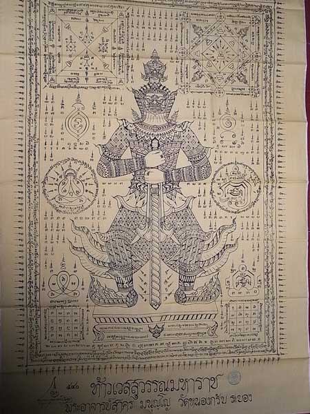 ผ้ายันต์ท้าวเวสสุวรรณมหาราช หลวงพ่อสาครปลุกเสก 1 ไตรมาส ผืนใหญ่ ขนาด0.80 ม. x 1.20 ม (สีเหลือง) จำนวนสร้างแค่ 1000 ผืน มีหมายเลขและปั้มตราวัดหนองกรับทุกผืน