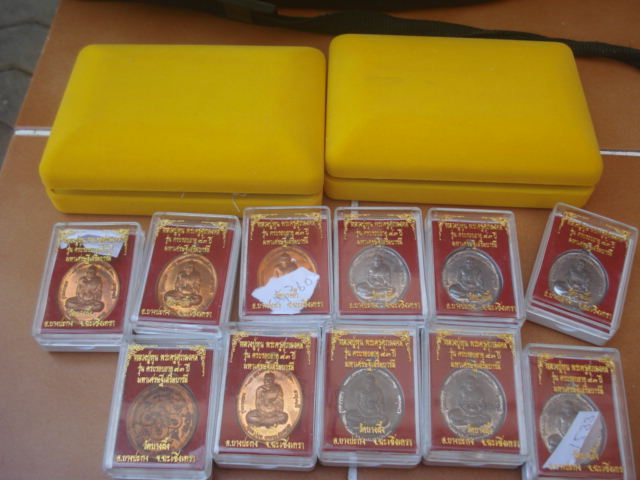 และมีเหรียญเนื้อตะกั่วมีจาร ในราคาเหรียญละ 250 บาท และเหรียญมหาเศรษฐีเสริมบารมี เนื้อทองแดง ในราคาองค์ละ 250 บาท มาแบ่งครับ