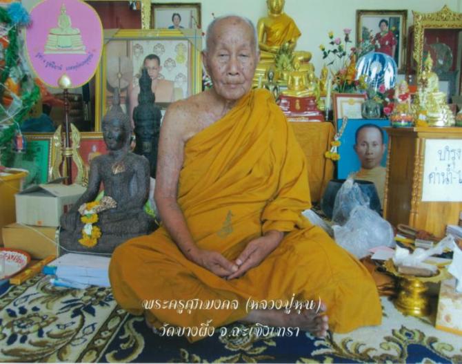 หลวงปู่หุน อายุ 93 ปี ท่านบวชตั้งแต่เป็นเณร จนเมื่อครบบวชพระท่านก็บวชพระและออกร่ำเรียนวิชากับพระอาจารย์ต่างๆ ในสมัยนั้นมากมาย โดยเฉพาะหลวงพ่อจาด วัดบางกระเบา เมื่อครั้งเกิดสงครามยุคมหาเอเชีย พ.ศ.2483 จอมพล ป.พิบูลสงครามได้ขอให้หลวงพ่อจาด วัดบางกระเบาช่วยทำตะกรุดแจกทหาร จนมีประสบการณ์มีชื่อเสียงในยุคนั้นมากมาย ครั้งหนึ่งมีเครื่องบินฝรั่งเศสมาทิ้งระเบิดใส่ทหารแต่ไม่มีผู้ใดได้รับบาด เจ็บเลย หลวงปู่หุนนี้แหละเป็นคนม้วนตะกรุดและพันตะกรุดให้หลวงพ่อจาดในตอนนั้นเอง และคอยรับใช้ในเรื่องต่างๆ จนหลวงพ่อจาดให้ความเมตตาในความขยันขันแข็ง ความอ่อนน้อมถ่อมตนของหลวงปู่หุน ท่านเมตตามากรักเหมือนลูก สอนวิชาต่างๆ ให้หมดสิ้น ทั้งสอนเสกพระ วิชาเมตตามหานิยม วิชาคงกระพัน โดยเฉพาะวิชาบังไพรหลวงพ่อจาดท่านเก่งมาก มีหลายครั้งที่หลวงพ่อจาดเรียกหลวงปู่หุนให้มานั่งเสกเหรียญและตะกรุดด้วย กัน เพราะอยากทดสอบลูกศิษย์ จนหลวงพ่อจาดเอ่ยชมว่า "เอ็งนี่แน่เสกได้เหมือนข้าไม่มีผิด ได้ดังใจข้าจริงๆ" จากนั้นหลวงปู่หุนก็ได้ลาหลวงพ่อจาดออกร่ำเรียนต่อไปอีกจนมาพบหลวงพ่อทอง วัดก้อนแก้ว ชาวบ้านแถวนั้นรู้จักดีเพราะหลวงพ่อทองเก่งมากในเรื่องวิปัสสนากรรมฐาน ช่วยชาวบ้านในเรื่องต่างๆ ทั้งเรื่องเงินๆ ทองๆ เดือดร้อนล้มละลาย เจ็บไข้ได้ป่วย หลวงพ่อทองช่วยได้ หลวงปู่หุนเลยฝากตัวเป็นลูกศิษย์ร่ำเรียนวิชาจนหมดสิ้นนานถึง 7 ปี แล้วหลวงพ่อทองให้ไปหาหลวงปู่คำปัน พระเขมรเพื่อสอนวิชาต่อ หลวงปู่หุนท่านก็ออกธุดงค์ไปจนได้พบ หลวงปู่คำปันได้ทดสอบวิชามากมาย มีคืนหนึ่งหลวงปู่คำปันเสกท่อนฟืนเผาผีเป็นตะขาบนับร้อยตัวยั้วเยี้ยไปหมด หลวงปู่หุนร่ายพระเวทย์ท่องมนต์แล้วลูบตะขาบให้กลับไปเป็นท่อนฟืนดังเดิม ถัดจากตะขาบก็เสกก้อนถ่านกลายเป็นผึ้งนับพันตัว หลวงปู่หุนท่านหยิบดิน 1 กำมือหลับตาท่องคาถา 1 อึดใจ ลืมตาโปรยดินใส่ผึ้ง จากผึ้งก็กลายเป็นถ่านดังเดิม เมื่อทดสอบวิชาผ่านหลวงปู่คำปันจึงสอนวิชาให้หมดสิ้น แล้วท่านก็ลาหลวงปู่คำปันเพื่อศึกษาต่อไป ปัจจุบันท่านเป็นเจ้าอาวาสวัดบางผึ้ง ได้ใช้วิชาที่ท่านเรียนมาช่วยเหลือลูกศิษย์ต่างๆ มากมาย ช่วยได้ทุกเรื่อง เศรษฐีแถวนั้นนับถือท่านมาก เพราะหลวงปู่หุนช่วยไว้เยอะจากล้มละลายกลายเป็นเศรษฐี จากคนจนกลายเป็นคนรวย หลวงปู่นี่แหละเสกแผ่นทองเข้าตัว นับว่าเป็นพระสุปฏิปันโนแห่งลุ่มน้ำบางปะกง