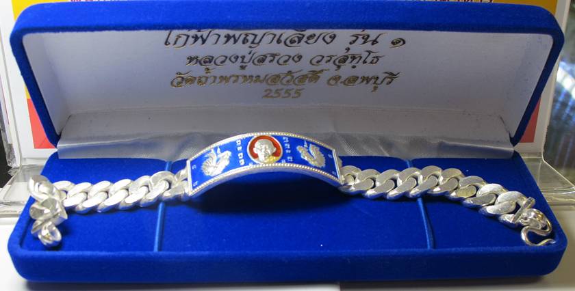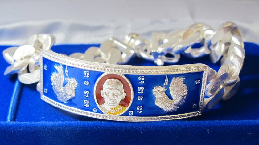 เลสเลสข้อมือไก่ฟ้าพญาเลี้ยง เนื้อเงินลงยาน้ำเงิน น้ำหนัก 4 บาท หลวงปู่สรวง วัดถ้ำพรหมสวัสดิ์ จ.ลพบุรี หมายเลข 240