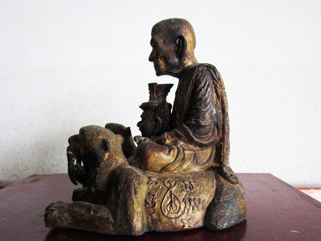 พระบูชาหลวงปู่กาหลง เขี้ยวแก้ว รุ่นแรก หน้าตักขนาด 5 นิ้ว นั่งเสือคู่อุ้มเศียรปู่สิงห์สมิงพราย ใต้ฐานบรรจุตะกรุด มวลสารศักดิ์สิทธิ์