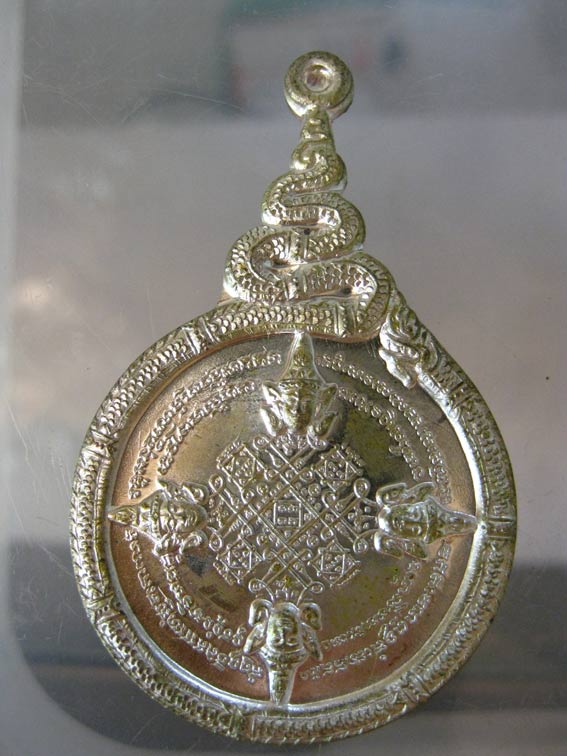 ด้านหน้าเหรียญได้นำพระยันต์ของพระพรหมที่เป็นตำรับเก่าแก่เป็นผูกกระดาษฝาง ที่ตกทอดกันมา ในตำราบอกบรรยายไว้มากมายสรุปได้อย่างนี้ว่า "ยันต์นี้ให้อธิษฐานตามแต่เธอจะปรารถนา จะคิดการสิ่งใด ก็สำเร็จเลิศเลอ ประเสริฐ ยิ่งนักแล" มีพญานาคขดล้อมยันต์พระพรหม ตวัดหางเป็นเลข ๙ เป็นสัญลักษณ์การเป่ายันต์พรหมครั้งที่ 9 ของหลวงพ่อ