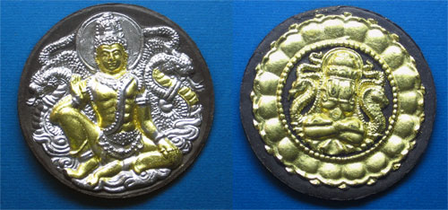 - พระผงว่าน จตุคาม ล้อมรอบด้วยพระราหู หลังหลวงปู่ทวด ขนาด 5.5 ซ.ม. เนื้อดินกากยายักษ์ ปิดเงิน