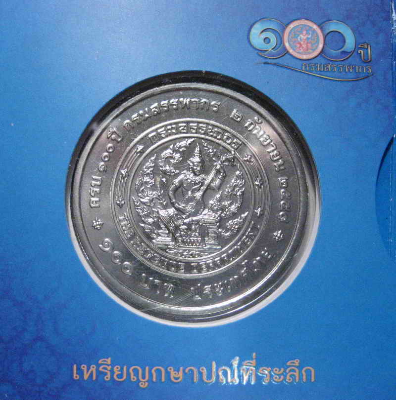 เหรียญกษาปณ์ 100 ปี กรมสรรพากร ชนิดราคา 100 บาท ทำด้วยโลหะสีขาว (ทองแดงผสมนิเกิล) บรรจุซองแผ่นพับออกแบบอย่างสวยงาม