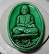 พระรูปเหมือนเคลือบเขียว พ่อท่านเอื้อม กตปุญโญ อายุ ๙๙ ปี วัดบางเนียน จังหวัดนครศรีธรรมราช จัดสร้างโดยพระครูโอภาธรรมาทร(พระอาจารย์สมปอง) สำนักสงฆ์บ้านสาคูใต้ ตำบลช้างซ้าย อำเภอพระพรหม จังหวัดนครศรีธรรมราช ได้ขออนุญาตพ่อท่านเอื้อม จัดสร้างพระรูปเหมือนพ่อท่านเอื้อมรุ่นแรกขึ้น ด้วยเนื้อผงว่านอันศักดิ์สิทธิ์มากมาย แล้วขอบารมีให้ท่านปลุกเสกเดี่ยวตลอดพรรษา ขนาดองค์พระกว้าง ๓.๙ เซนติเมตร สูง ๕ เซนติเมตร รับประกันความแท้ตลอดชีวิต เก๊คืนเงินเต็มร้อยเปอร์เซ็นต์ |