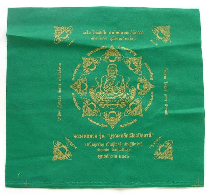 ผ้ายันต์ บูรณะหลักเมืองปัตตานี มีให้เลือก5 สี แดง ดำ น้ำเงิน เหลือง เขียว สวยทุกสีค่ะ จำนวนการสร้างทุกสีรวมกันทั้งหมด 4,000 ผืน ค่ะ