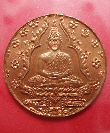 ...ลักษณะเหรียญเป็นแบบปั้มกลมแบนขอบเลียบ ด้านหน้าเหรียญ ภายในซุ้มเรือนแก้วเป็นรูป พระแก้วมรกต ประทับนั่งบนฐานบัวคว่ำบัวหงาย มีผ้าทิพย์ห้อย และดอกไม้อยู่โดยรอบ ด้านหลังเหรียญ เป็นรูปยันต์กงจักร มีอักษรจารึก มรรค ๘ อักขระขอมที่ปรากฏ คือ
