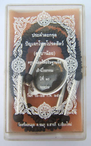 ประคำตะกรุด "ปัญเจกโพธโปรดสัตว์" ครูบาน้อย วัดศรีดอนมูล จ.เชียงใหม่ สร้างจากกระลาตาเดียว ตัวตะกรุดสร้างจากแผ่นเงิน5ดอก และรูปเหมือนเนื้อผงกระลาตาเดียว สำหรับประคำชุดนี้ครูบาน้อยได้อธิฐานจิตในพิธีเข้านิโรธกรรมเป็นปีที่10ระหว่างวันที่16-22ก.พ.2546เป็นเวลา7วัน7คืน โดยในพิธีนี้ครูบาน้อยไม่ฉันอาหารเลยตลอดระยะเวลาในการเข้านิโรธสมาบัติ สำหรับตัวตะกรุดได้ปลุกเสกด้วยวิชากาสะท้อน(มีชื่อว่าตะกรุดกาสะท้อน) เด่นดังในด้านหยุดระงับสิ่งอัปมงคลทั้งปวง อันเป็นวิชาที่ครูบาผัดองค์อาจารย์ถ่ายทอดวิชามาให้แก่ครูบาน้อย พระทุกองค์ที่นำลงประมูลรับประกันความแท้ตามกฏกติกาทุกประการ