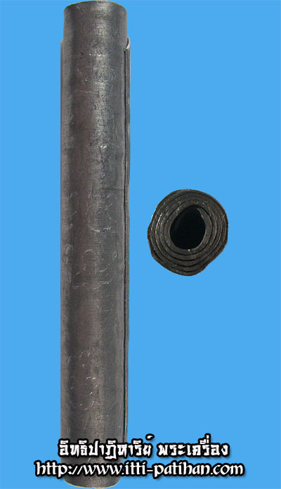 ทำตัวแผ่นตะกั่ว ปั๊มยันต์ ยาว ประมาณ 3 นิ้วครับ ช่วงหลังๆนี้ทางวัดจะใช้วิธีปั๊มออกมาครับ เพราะตะกรุด ของท่านคนต้องการมาก และมีประการณ์ทางด้าน มหาอุด คงกระพันชาตรี เป็นที่เลื่องลือมาก ทำให้ไม่พอ ต่อความต้องการ แต่ใช่ว่าตะกรุดปั๊ม จะไม่มีประการณ์ นะครับ มีผู้บูชาไปโอนยิงมาไม่ออก โอนฟันมาไม่เข้า หลายรายแล้วนะครับ และพวกที่ชอบลองยิงพระ รายงานมาแล้วว่า ตะกรุดปั๊มก็ยิงไม่ออกครับ บูชา 150 บาท