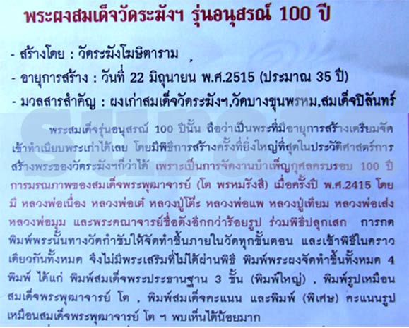 โดยสมเด็จวัดระฆัง 100 ปี องค์นี้เป็นพิมพ์ไข่ปลาเลือน (นิยมมาก) คัดสวย กริ๊บๆ องค์นี้ส่องแล้วเห็นเม็ดมวลสารชัดเจน องค์ล่ำหนา น่าเกรงขาม สภาพเดิมๆ 35 ปี ขอบพระมีรอยข้าวตอกตัดของสัญลักษณ์พระแท้์ ตัวจริงชัดเจน หลังปั๊มตรายางวัด อนาคตราคาทะลุหมื่นแน่ครับ