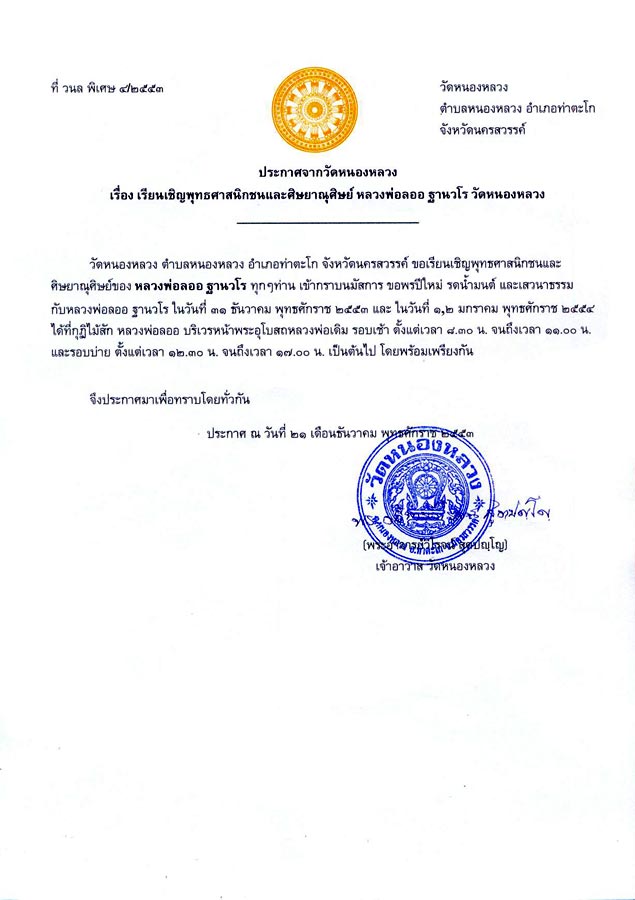 ขอเรียนเชิญพุทธศาสนิกชนและศิษยาณุศิษย์ของ หลวงพ่อลออ ฐานวโร วัดหนองหลวง ทุกๆท่าน