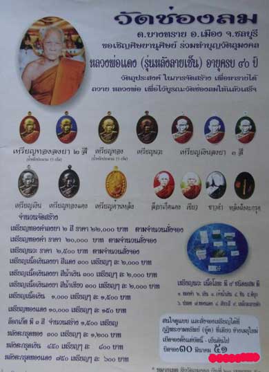 หลวงพ่อแดง วัดช่องลม ชลบุรี รุ่นลายเซ็น หรือ ฉลอง 90 ปี เนื้อเงิน สร้าง 1000 องค์เท่านั้น เป็นรุ่นที่ทางวัดช่องลม ชลบุรีสร้างเองอย่างเป็นทางการ สุดยอดประสบการณ์ แคล้วคลาด แบบสุด ๆ คนภาคตะวันออกลองใช้แล้วบอกว่าสุดยอดจริง ๆ เพชรน้ำเอกเมืองชลบุรีอีกองค์ที่คนชลบุรียอมรับแล้ว ต่อไปจะขยายวงกว้างในอนาคตแน่นอน และ ค้าขายก็สุดยอด หาเก็บกันไว้นะ สุดยอดจริง ๆ อยากบอกต่อ |