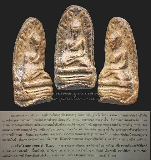 พระรอดเเสงตาหน่อเนื้อเชื้อมหาวันโดยแท้ สร้างขึ้นในยุคปี2400กว่าๆ โดยพระภิกษุชื่อว่า "เเสงตา" ท่านสร้างไว้เพื่อบรรจุในกรุเเท่นเเก้วเเละกรุที่ฝังดินบริเวณในสิ่งก่อสร้างของวัดมหาวัน ลำพูนพระรอดเเสงตาสร้างขึ้นโดยการเเกะพิมพ์ใหม่ไม่เหมือนพิมพ์อื่นๆของวัดมหาวันเลย เเต่จะสร้างจากเศษพระที่ชำรุดเเตกหัก เช่น พระรอด พระคง พระเปิม พระเลี่ยง พระสิบสอง ฯลฯขนาดขององค์พระจะเท่าๆกับพระรอดโดยทั่วไป เเต่ค้างหรือใบหน้าจะเเหลมยาว คอจะเป็นลำ ตั้งเเต่ค้างจนถึงหน้าอก เมื่อปี2500 ได้มีการนำพระรอดเเสงตามากดพิมพ์ใหม่อีกครั้ง เเต่ได้ประทับตรายางไว้ด้านหลัง ว่ารุ่นสร้างโรงพยาบาลสงฆ์ปี2500 เเต่เนื้อหาความเก่าคลาสสิคยังห่างจากพระรอดแสงตา กรุวัดมหาวัน จ.ลำพูนในยุคปี2400กว่าๆ อยู่มากครับพระรอดแสงตาหน่อเนื้อเชื้อมหาวันโดยแท้ มีพิมพ์เเละประวัติชัดเจนขึ้นคอเเล้วสบายใจเเน่น |