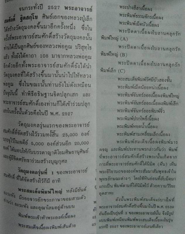 ได้สร้างวัตถุมงคลขึ้นมา อีกครั้งหนึ่ง ซึ่งในครั้งที่พระอาจารย์ สมศักดิ์ ฐิตสกฺโข สร้างวัตถุมงคลนั้น ท่านได้เป็นลุกศิษย์ของ หลวงพ่อคูณปริสุทโธ แล้ว ทั้งยังได้คาถา 108 จาก หลวงพ่อคูณ ปริสุทโธ อีกด้วย อีกทั้งพระอาจารย์ สมศักดิ์ ฐิตสกฺโข ยังได้นำวัตถุมงคลที่ได้สร้างขึ้นมานั้น นำไปให้ หลวงพ่อคูณ ปริสุทโธ ซึ่งในขณะนั้นท่านยังไม่ดังเหมือนในปัจจุบันนี้ ทำพิธีอธิษฐานจิตปลุกเสก และ พระอาจารย์ สมศักดิ์ ฐิตสกฺโข เองท่านก็ได้เข้าร่วมปลุกเสกในครั้งนี้ด้วย คือใน วันเสาร์ ที่3 มีนาคม พ.ศ.2527