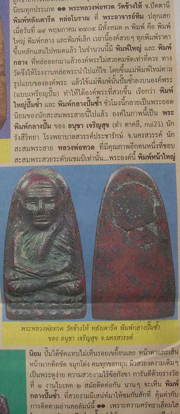 ช้างเผือกย่อมอยู่ในป่า...พระภูธรยังไปผงาดในเมืองกรุง...วันนี้ท่านได้ลงในหนังสือพิมพ์"คมชัดลึก".....ด้วยความงดงามคสาคสิคสุดๆอันดับต้นๆของวงการ...จนทำให้ บก.แล่ม จันท์พิศาโล ทนต่อความงามไม่ไหวต้องนิมนต์ท่านลงให้ยลโฉมใน"คมเลนส์ส่องพระ"...องค์นี้เป็นองค์หนึ่งที่ผมภาคภูมิใจมากๆ...ตอนนิมนต์ราคาก็เป็นสถิติของประเทศ(ในพิมพ์กลางปั้ม)และณ.ตอนนี้ก็มีคนมาบุกให้ราคามากว่าตอนที่ผมนิมนต์มา2เท่าตกลงเมื่อไหร่จะมารับเองที่นครสวรรค์...ด้วยความชอบและศรัทธาหลวงพ่อทวดผมเลยใจแข็งปฏิเสธไปถือคติที่ว่า"เงินหาเมื่อไหร่ก็ได้แต่พระสวยบางทีทั้งชีวิตอาจจะไม่มีโอกาสได้ครอบครองเลย"...ทุกวันนี้นำมาส่องทีไรก็ยิ่งสุขใจครับท่าน......ขอขอบพระคุณ...นะมัสเต |