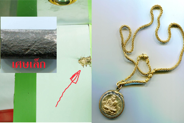 ผมว่าผมรอดเพราะดวงผม..กับสิ่งศักดิ์สิทธ์...หลวงปู่ทวดครับ... เมื่อวันที่ 17 เกิดเหตุระเบิดที่ปัตตานี..ซึ้งผมอยู่ร้านถ่ายรูป ห่างจากจุดเกิดเหตูประมาณ...25-30 เมตร..เสียงดังตูม..กระจกที่ร้านแตกทันที 3 บาน...ผมเช็คตัวเองไม่เป็นรัยปัดฝุ่นและเศษกระจกเล็กๆออกจากตัวหยิบกล้องถ่ายรูปออกไปถ่ายก่อนเลย...ตอนนั้นไม่ค่อยมีครัย..กลับเข้ามาเช็คในร้าน ..ที่เสาผมทำลูกศรไว้..เศษสะเก็ดระเบิดกระเด็ฯทะลุกระจกเข้ามาโดนเสาตามรูป ผ่านหัวผมไป 1 ฟุตเอง..เอามือจับหลวงปู่ทวดแล้วยกมือไว้ทันทีครับ...ไม่เชื่อก้อต้องเชื่อ..เศษเหล็กในรูปเล็ก..ตัดขาขาดเลยนะครับ...(..มาเล่าสู่กันฟังนะครับ..ผมไม่ได้เชียร์พระนะครับ... |