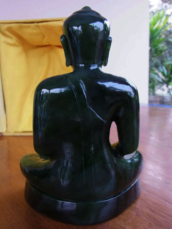 องค์นี้หยกสวยมากครับ เขียวมรกตครับ เรียกได้ว่า เกรดA ครับ หยกที่มีสีเขียวสดเข้ม มีไม่กี่องค์ครับที่เขียวสวยขนาดนี้ ส่วนมากที่เจอก็จะมีสีขาว ผสมในเนื้อหยกเยอะ บางท่านก็ตีไปเป็นปลายหยก หยกเกรด B ,C คับ ในจำนวนสร้างทั้งหมดจาก 2534 องค์ ตรงตามปี พ.ศ สร้าง องค์นี้แกะจากโรงงานที่ 1 คือ โรงงานวาลินนานกู เมืองปักกิ่ง ประเทศสาธารณรัฐประชาชนจีน คือโรงงานแม่ จึงแกะออกมาได้เหมือนองค์จริง และองค์อื่นๆ แ่บ่งส่งไปแกะที่โรงงานลูก อีก 2 แห่ง