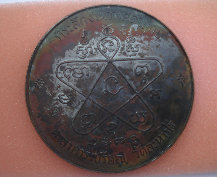 ยันต์ห้า พร้อมอักขระข้อความว่า ที่ระลึกงานวางศิลาฤกษ์ ศาลาการเปรียญ วัดละหารไร่ ปรากฎว่า