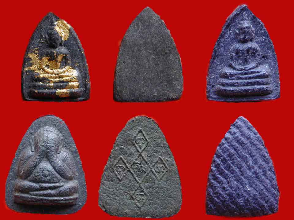 ลักษณะพิมพ์ เนื้อผงคลุกรัก รูปร่างคล้าย 3 เหลี่ยม ด้านเป็นรูปพระพุทธ ปางสมาธิ